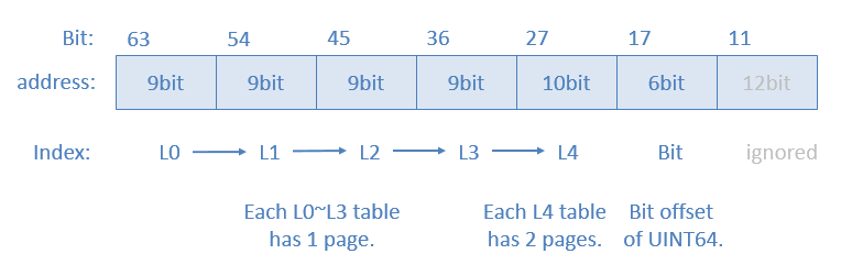 This table uses 1 bit to track 1 page. 1 UINT64 entry tracks 256K memory. 1024 UINT64map table tracks 256M memory. The 5 levels of table can track any address of memory in 64bit system.