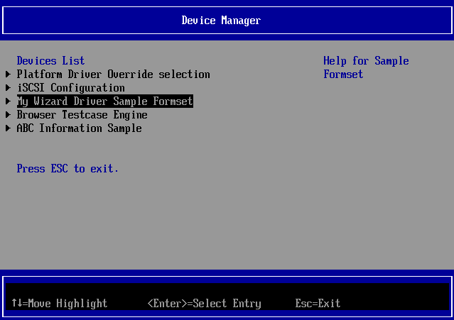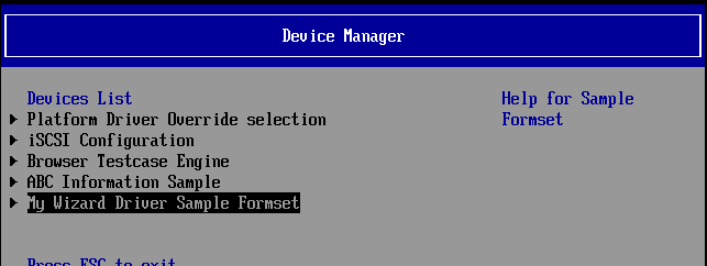- Inside the Device Manager menu Notice that the My Wizard Driver Sample Formset is added without having to issue the “Load” command from the shell prompt.