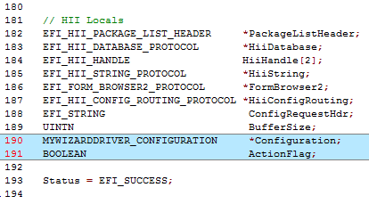 9). Add Locals: first add 2 locals for your drivers configuration buffer and a boolean flag from the Hii Library calls