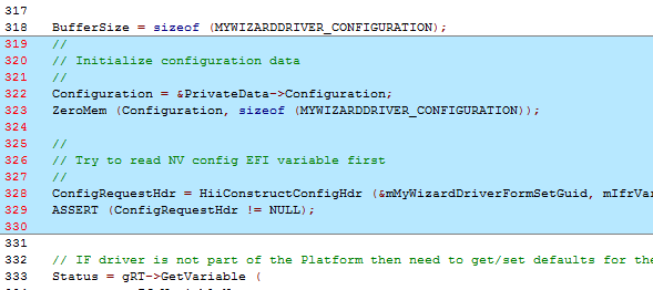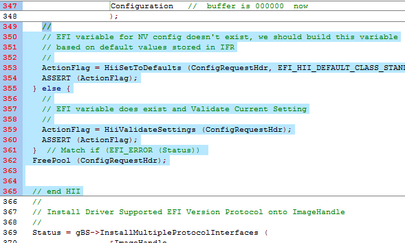 The HII Library in the MdeModulePkg has many functions to help with Communication to/from the Hii Database and Hii forms. One function call HiiSetToDefaults will compare the default settings from the .VFR file and update the driver’s configuration buffer according to the settings in the .VFR file.
