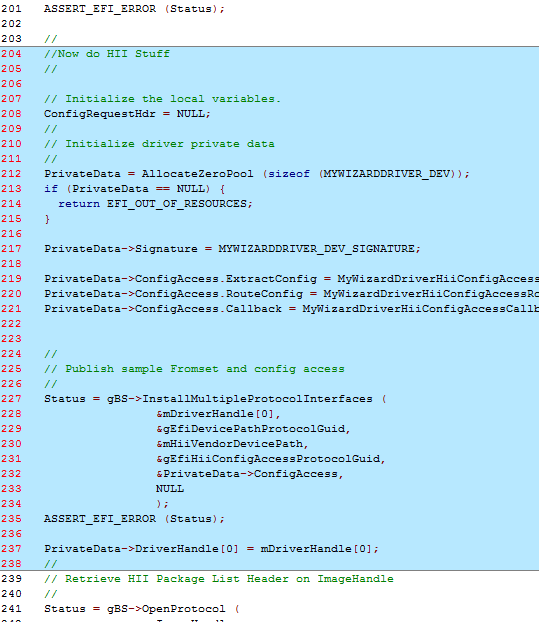 15). Locate the ASSERT_EFI_ERROR (Status); statement and the line: // Retrieve HII Package List Header on ImageHandle (approximately line 202). Now, add the following code to install the configuration access protocol (produced) by copying and pasting (as shown below) before the line: // Retrieve HII Package List Header on ImageHandle