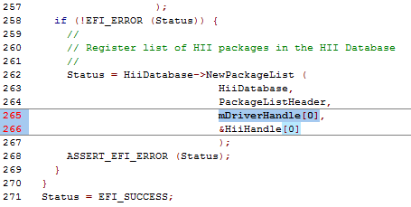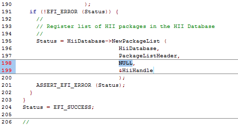 16). Next, add code to register a list of HII packages in the HII Database with the HII device path. This requires you to replace existing code (see below) by copying and pasting the new code at approx. line 265.