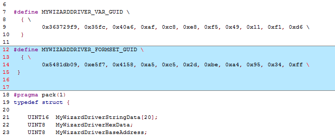 - Update the MyWizardDriverNVDataStruc.h file by copying and pasting the following GUID as shown below: This GUID is used to communicate to the HII Database and Browser Engine