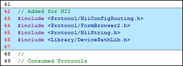 10). Update the MyWizardDriver.h file. Add the following HII libraries starting at approximately line 41 (as shown below) by copying and pasting: