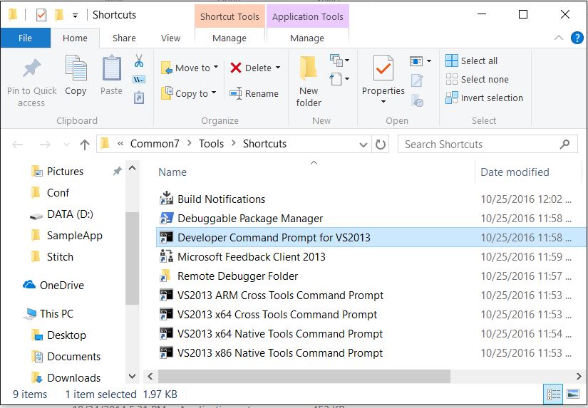 - Right Click on “Developer Command Prompt for VS201n” NOTE: Make sure you are selecting the correct Command prompt for Visual Studio. For VS2013 it is: “Developer Command Prompt for VS2013”